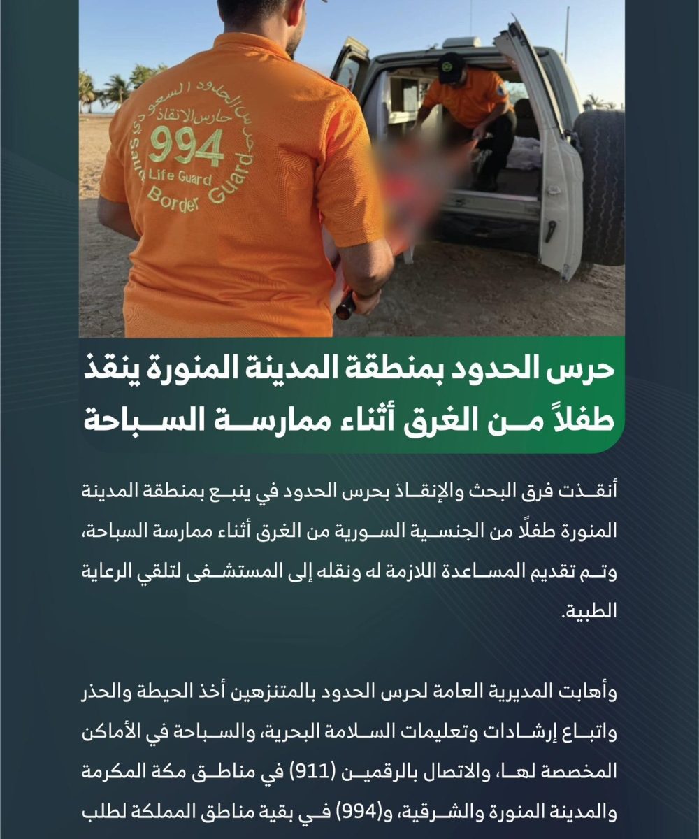 أنقذت فرق البحث والإنقاذ بحرس الحدود في ينبع بمنطقة المدينة المنورة طفلًا من الجنسية السورية من الغرق في أثناء ممارسة السباحة.