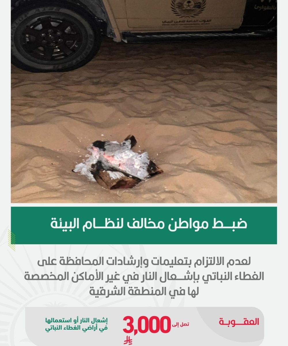 ضبطت القوات الخاصة للأمن البيئي مواطنًا مخالفًا لنظام البيئة؛ لعدم الالتزام بتعليمات وإرشادات المحافظة على الغطاء النباتي بإشعال النار في غير الأماكن المخصصة لها في المنطقة الشرقية، وطبقت الإجراءات النظامية بحقه.