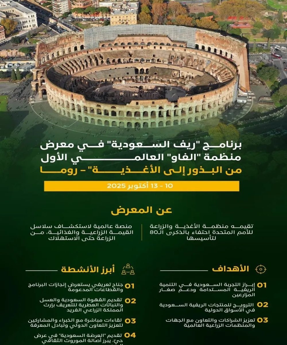 روما.. المملكة تطرح نموذجها الريفي المستدام في معرض “فاو” العالمي
