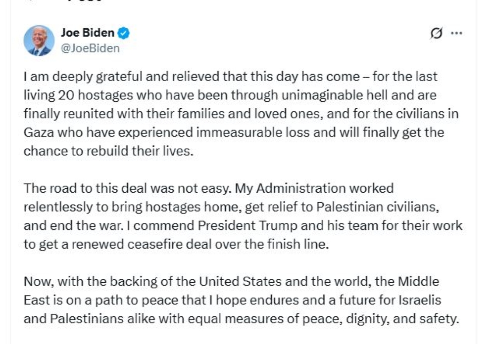 وقالت نائبة الرئيس السابقة ومناسفة ترامب بالانتخابات الأمريكية الأخيرة، كامالا هاريس، إن هذا اليوم يُمثل خطوة أولى مهمة نحو مستقبل أكثر تفاؤلًا، مشيدة بـ”القادة والشركاء” الذين ساهمت جهودهم في تحقيق هذا الاتفاق، بمن فيهم الرئيس وفريقه..