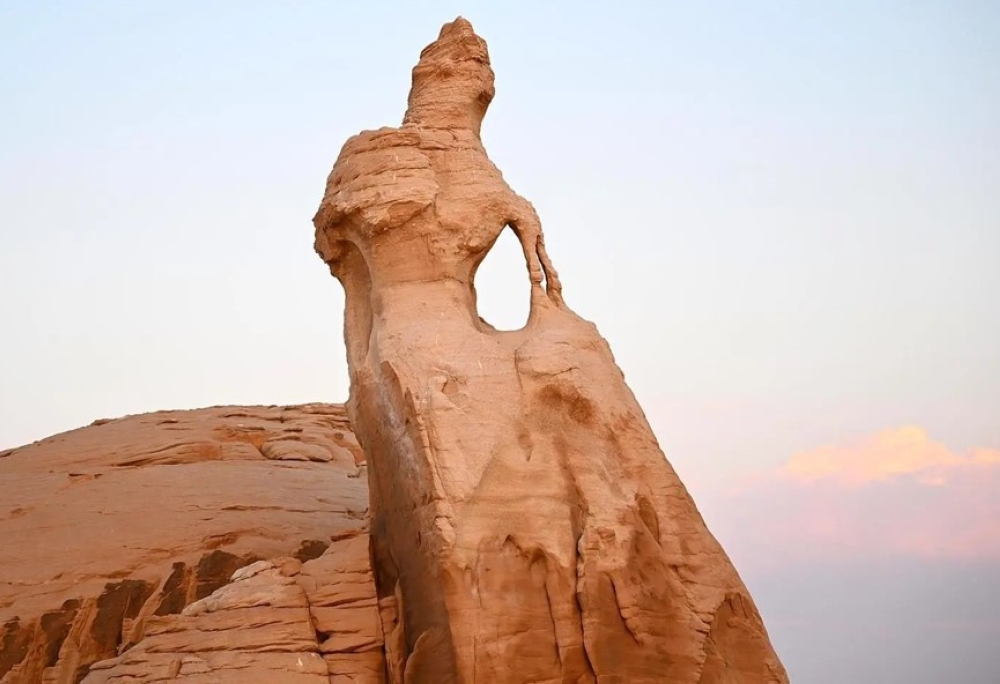 تمثل “صخرة العروسة” تشكيلًا جيولوجيًا نادرًا يُشبه عروسًا تُمسك بثوبها وسط الرمال.