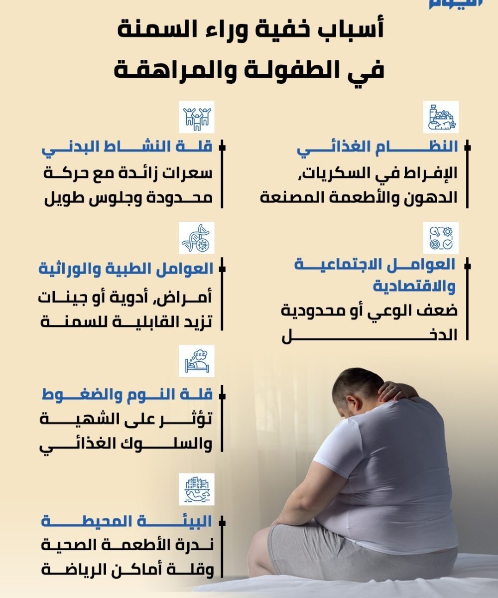 قلة النشاط البدني: سعرات زائدة مع حركة محدودة وجلوس طويل.