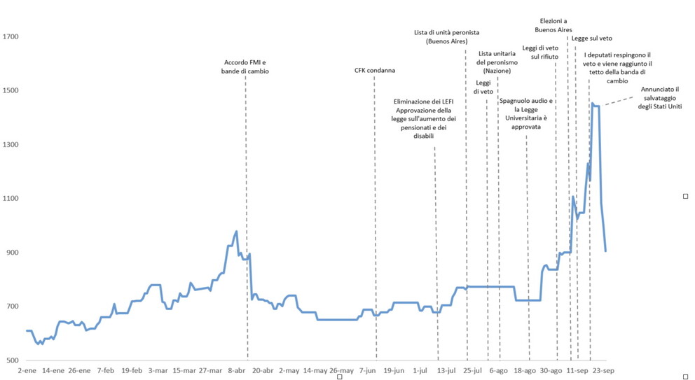 Dopo la pesante sconfitta elettorale del governo per mano del peronismo nella provincia di Buenos Aires si registra un forte balzo, seguito da un lieve calo dopo il discorso presidenziale e la decisione di porre il veto alla legge di finanziamento universitario.