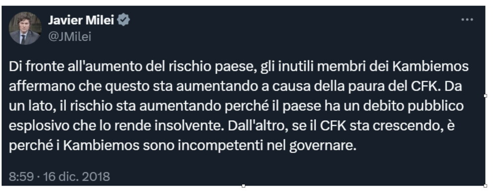 In definitiva, il comportamento del rischio Paese mostra che i mercati non si muovono per ideologia o simpatie di partito. Si muovono, in misura maggiore, in base a segnali concreti sulla capacità del governo di pagare il proprio debito, ossia in base alla coerenza del programma economico più che al rischio politico. Lo stesso Milei (nel 2018) concordava su questo punto.