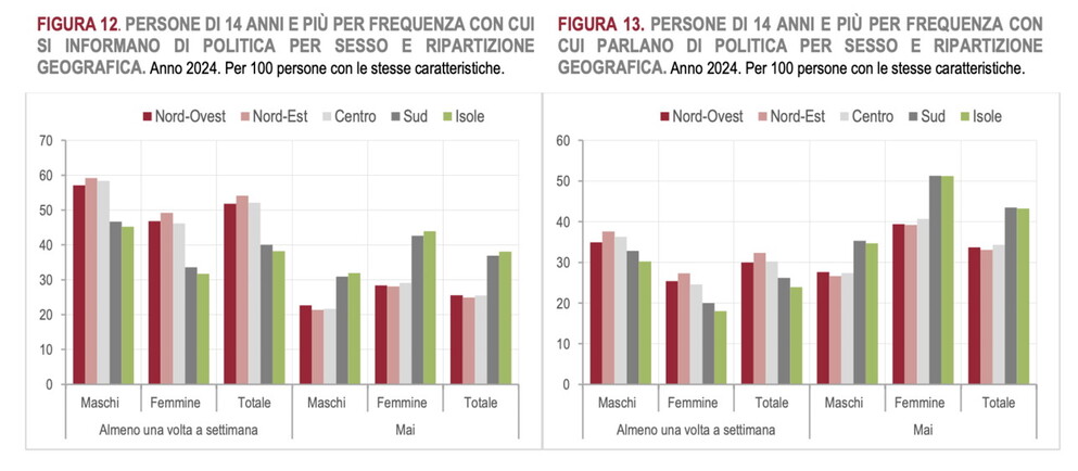 La partecipazione politica è molto differenziata sul territorio. “Si informa di politica almeno una volta a settimana la maggioranza della popolazione del centro-nord (con valori compresi tra il 52 e il 54 per cento), contro il 40 per cento circa del Mezzogiorno. Sempre nelle regioni del Mezzogiorno una quota analoga (37,3 per cento) non si informa mai a fronte del 25,0 per cento circa delle regioni del nord”. Calabria, Sicilia e Campania sono i fanalini di coda della partecipazione.