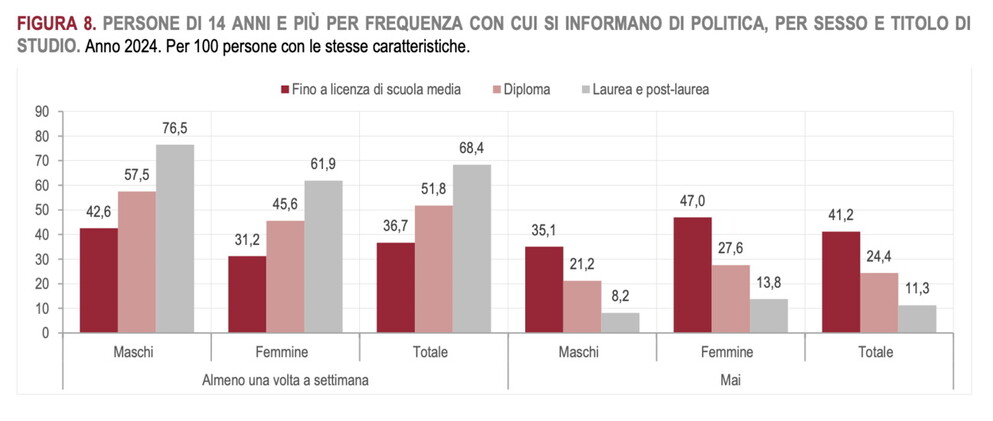 Influenzano la partecipazione il titolo di studio, cioè l’istruzione e la scuola, e la condizione lavorativa: “La disaffezione totale per l’informazione e la discussione politica è più diffusa in presenza di titoli di studio più bassi. Non si informa mai di politica l’11,3 per cento dei laureati, una percentuale più che doppia di diplomati (24,4 per cento), e quasi quadrupla per quanti hanno al più la licenza media (41,2 per cento). Un trend analogo si osserva in merito al parlare di politica”. Per quanto riguarda il lavoro, l’Istat rileva che gli occupati, insieme ai ritirati dal lavoro, si informano e parlano regolarmente di politica più degli altri segmenti di popolazione: “Si informa regolarmente di politica il 52,3 per cento degli occupati e il 61,6 per cento dei ritirati dal lavoro a fronte di un valore medio del 48,6 per cento riferito alla popolazione di 15 anni e più”.