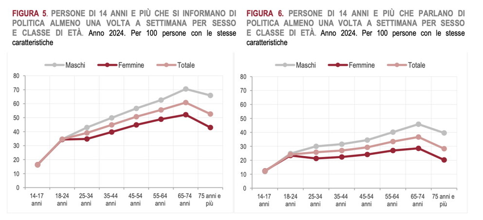 Prima di procedere, esaminiamo però più attentamente alcuni aspetti di questa indagine, in particolare quelli riguardanti i divari di genere, di età e territoriali, i motivi del disinteresse e i fattori che contribuiscono all’interesse per la politica, quali il titolo di studio e l’esperienza lavorativa, sempre valendoci dell’indagine Istat. Secondo quest’ultima, “permangono evidenti differenze di genere che vedono gli uomini partecipare più numerosi alla vita politica del paese. Nel 2024, poco più di due donne su cinque (42,5 per cento), infatti, si informa settimanalmente di politica, contro il 54,1 per cento degli uomini. In particolare, è sull’informazione quotidiana che il gap di genere è più evidente (27,6 per cento degli uomini e 19,0 per cento delle donne)”.