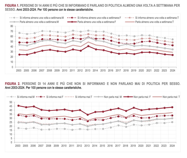 Tra il 2003 e il 2024, si è osservato un calo generalizzato della partecipazione invisibile (informarsi e discutere di politica). Questo trend riguarda uomini e donne, ma con intensità diverse, contribuendo a ridurre le ampie differenze di genere. Nel 2003, a informarsi con regolarità di politica era il 66,7 per cento degli uomini a fronte del 48,2 per cento delle donne. Nel 2024 questi valori calano di 12,6 punti percentuali per gli uomini e di 5,7 punti per le donne. La differenza tra uomini e donne passa da 18,5 a 11,6 punti percentuali”. Questa la sintesi della recentissima accurata analisi della partecipazione politica in Italia, svolta dall’Istituto nazionale di statistica. Dunque, la distanza tra paese reale e paese legale non è misurata soltanto dalla decrescita della partecipazione al voto dei cittadini italiani, che dal 93 per cento è ora calata al 63 per cento, ma anche dalla disaffezione per la politica o dal disinteresse per essa mostrato da questi dati. Essi misurano la distanza tra il paese e la sua classe dirigente. Ecco, dunque, una indagine che cultura e politica italiani dovrebbero studiare con molta attenzione perché da essa, piuttosto che dalle piccole liti quotidiane, dipende il futuro del paese.