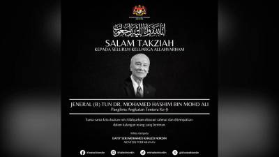 KUALA LUMPUR: Defence Minister Datuk Seri Mohamed Khaled Nordin has paid tribute to former Chief of Defence Forces General Tun Dr Mohamed Hashim Mohd Ali, who passed away today.