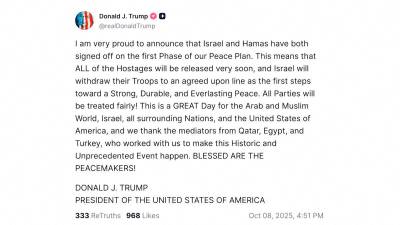 “I am very proud to announce that Israel and Hamas have both signed off on the first Phase of our Peace Plan,“ Trump said on Truth Social.