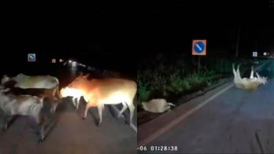 In the 30-second dashcam footage, the bus was travelling at night along the Gua Musang – Kuala Krai route when it suddenly encountered a group of cows crossing the road. Despite the driver braking hard, the bus struck several animals, some of which were visibly thrown by the impact.
